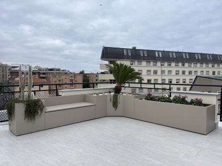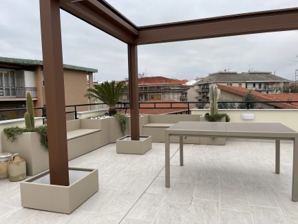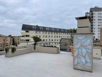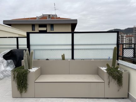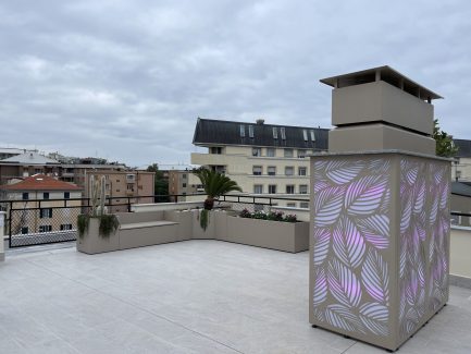 Von der 𝗰𝗼𝗺𝗽𝗼𝘀𝗶𝘇𝗶𝗼𝗻𝗲 von quadratischen und rechteckigen Pflanzgefäßen, die zusammen mit den Behälterbänken strategisch in die Ecke positioniert wurden, bis zur Abdeckung mit RGB -Lichtern, um den Schornstein abzudecken, blieb nichts dem Zufall überlassen.