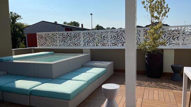 La particolarità di questi terrazzi sagomati è la difficoltà nell’arredarli su misura. Il punto di forza è l’unicità, con la forma particolare che gioca con le forme e dà movimento, creando un’illusione di onde sinuose. Noi abbiamo solo seguito il percorso tracciato, realizzando al millimetro arredi che potessero valorizzare ancora di più queste forme particolari.…