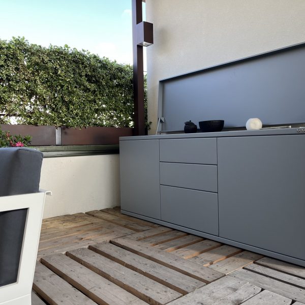 Completa la tua zona outdoor con arredi creati ad hoc. Mantieni lo stile della tua cucina da esterno scegliendo tra fioriere, armadi, tavoli, bracieri, copri-condizionatori, mobile portarifiuti e panche contenitore.