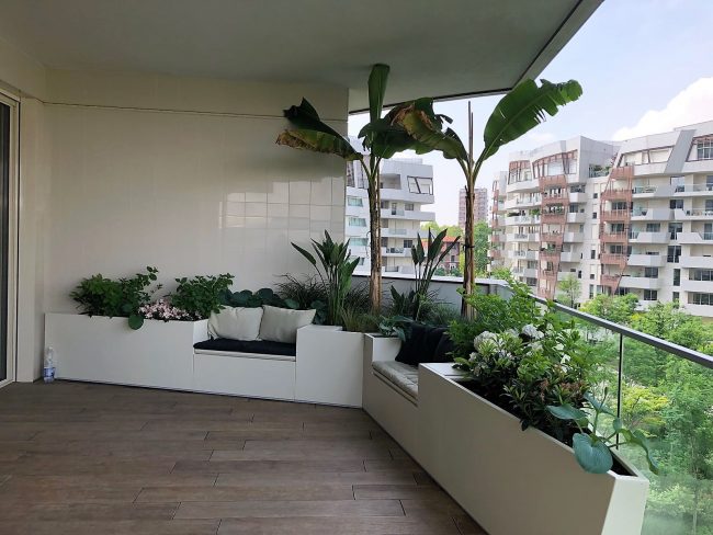 Las macetas con forma siguen el perímetro particular del exterior. La esquina, de hecho, está configurada con bancos cubiertos de tela náutica repelente con agua.
